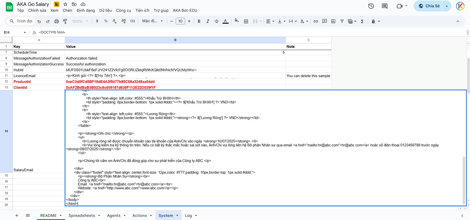 Tại sheet “System”, bạn soạn thảo tiêu đề và nội dung phiếu lương. Sử dụng cú pháp thông minh để tự động điền các thông tin riêng cho từng nhân viên.